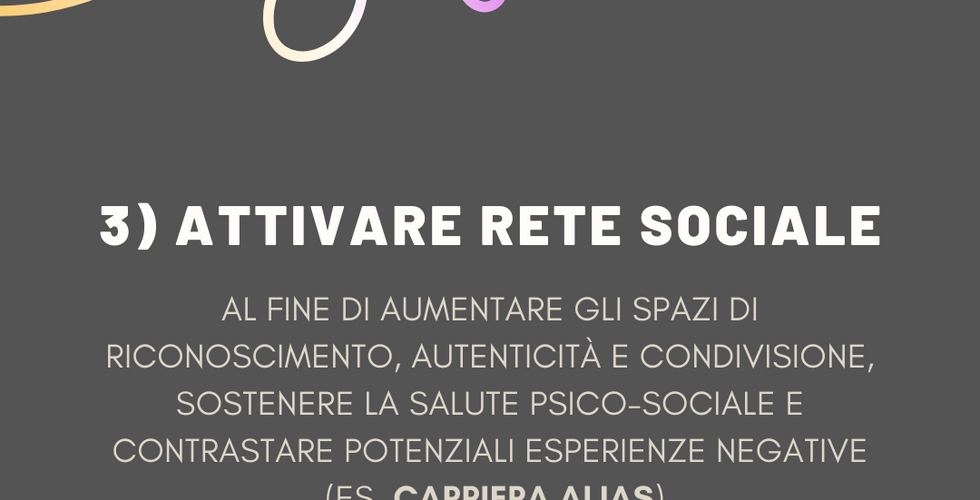Nel frattempo, se la persona trans lo desidera o lo ritiene sostenibile, può essere importante coinvolgere la rete sociale intorno (scuola, associazioni sportive, ecc.) al fine di aumentare gli spazi di riconoscimento, validazione, autenticità e condivisione, proteggere la salute e il benessere psico-sociale e contrastare potenziali esperienze negative (es. stress, ansia, depressione, bullismo omotransfobico, ritiro sociale e/o scolastico, ecc). Uno strumento utile in tal senso può essere la carriera alias, che come affermano Agedo e Genderlens costituisce un "accordo di riservatezza tra scuola, studente e famiglia (se minorenne) che permette di inserire nel registro elettronico il nome scelto dalla persona transgender al posto di quello anagrafico".
