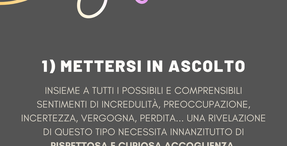 Forse - come adulti e/o persone care - vi sentite perplessi, sconvolti, preoccupati. Disorientati. Insieme a tutti questi possibili e comprensibili sentimenti di incredulità, incertezza, vergogna, perdita, una rivelazione di questo tipo (“coming out”) necessita innanzitutto di rispettosa e curiosa accoglienza. Rappresenta un punto di arrivo, verosimilmente l'esito di un percorso di scoperta di sé lungo e laborioso, ma è anche un punto di partenza.